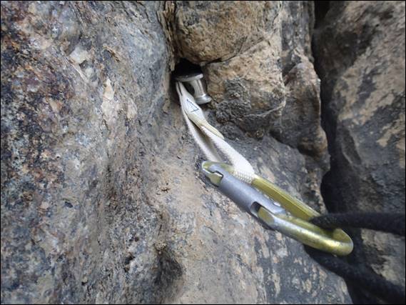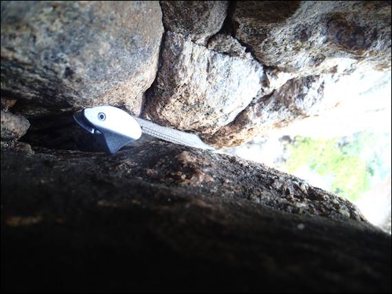 It wasn’t that my route had been too hard and worn him down too much, as it really wasn’t very difficult. In fact the line isn’t even written up as a route, and I doubt that anyone ever thinks to climb it. I picked the line because I could tell we needed to go easy, and more importantly because I saw a great opportunity to place a sling. This was the only piece I used that wasn’t a tricam, and I also used a wired tricam! After we got back down and I offered Steve two options, pack up and walk out or climb out with the packs. I was quietly happy when he voted for the latter:
