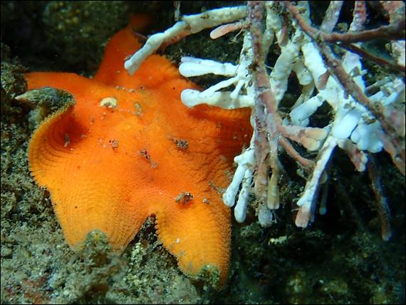 Above is a Bat Star seastar (Patiria miniata) that not surprisingly gets its name from the webbing between the arms. I’ve seen them before, but not in bright orange. It seems this seastar is a bit of a gut bucket and will eat both plants and animals, regardless of whether they are alive or dead. It does this by covering the food source with its stomach, releasing digestive juices that liquefies the food and then ingesting the tasty meal. It is also a bit different in that there are no pincers, which most starfish use to clean their skin surface. Instead it has small, moving hairs that create enough of a water current to keep its skin clean: