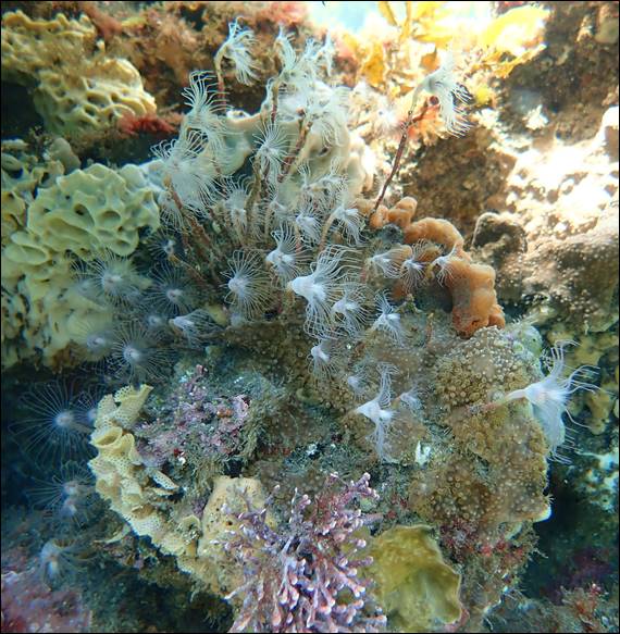 I had to include one image of a fish, and for this post it is a female Brown Spotted Wrasse, Notolabrus parilus. Whenever I kicked my fins to come back up from a duck dive I would stir up the sediments, and within second these fish would be darting though the murky water I left behind. I’m guessing looking for food. I can tell I’m out of snorkelling practice, as my breathe holding ability seems to have waned somewhat. I felt like I struggled to stay down too long, but I made an extra big effort when I came across this floral garden arrangement: