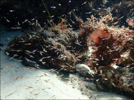 I’ve made a mental note of the location I found this amazing sight, which was under a rock shelf, and hope to be able to find it again to get some better close up images. They are obviously not feather duster worms, but I’m pretty sure they are filter feeders of some type. I can only guess they are tube worms, but have failed miserably in trying to find out any more detail on them. While I wasn’t feeling cold, after what felt like ages I started to make my way in. That was until I got distracted by this school of Western Striped Grunter, Helotes octolineatus: