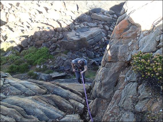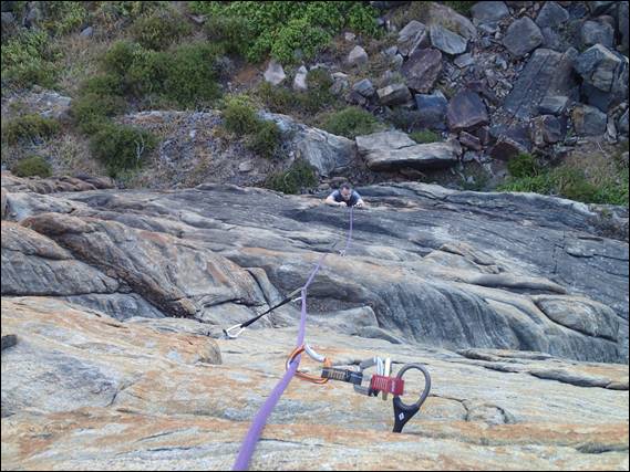 They were however heading to the main cliffs, and we left then behind as we followed the cape to cape track until we got to the Northern Blocks. From here there is a fun rock hop along the coast. Granted we could have driven to nearly the top for the crag, which Steve would have loved doing. But I like the walk, and Matthew had said he too was looking forward to the walk in. I expected the rock to be a tad damp, not only from the rain but also the salt spray that was blowing up from the waves. But it was fine, and after a quick run through of belaying and tying in, just in case, I was off: