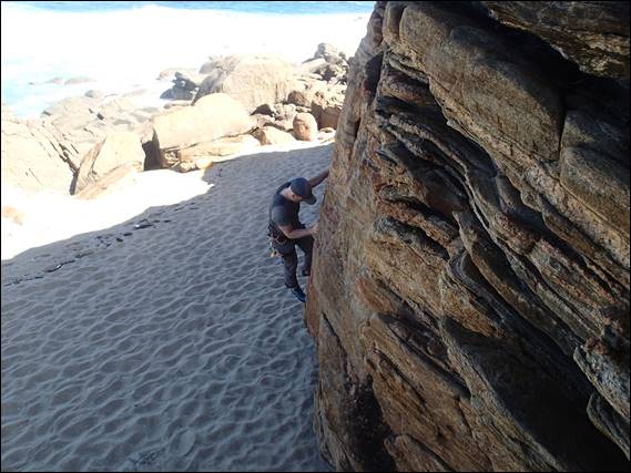 My rationale being that Matthew would be testing himself enough without needing to fiddle out any passive such as wires, tricams or hexes. While he admitted his flexibility let him down on some moves, he still pulled off the climb. I could see that his muscle memory from a decade back, wasn’t vanquished it had just lay dormant waiting until it was needed again. The first line, including his first contact with the good old Australian carrot bolt, hadn’t put him off. Next up was Baby Shower, at a similar grade, that was approx. equivalent to the British grade of HS 4a/4b: