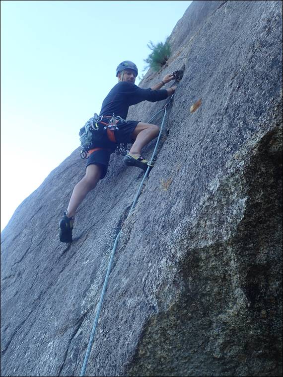 The cracks on this crag can hold water for a long time, even long after the seasons have changed. On previous trips we have been serenaded by the sound of frogs singing, unseen as they remain hidden deep in the damp crevices. Not today, everything was bone dry and the air was instead filled with the sound of crickets chirping. They don’t normally sit still when we come crashing about, but the one above was content to stay while Mario led Mr Hitachi. It remained in the same place until after we had finished on the route: