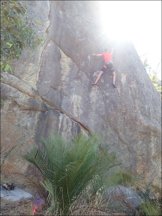 In 2014 on my first trip here with Wiggins the small tree had a little bit of greenery, but it wasn’t looking too good (https://sandbagged.blog/2014/07/13/another-day-out/). Then on my second time here with Craig, two years later, it was dead. So I am surprised that it has stayed in place as long as it has (https://sandbagged.blog/2016/10/23/heading-inland/). This is the best of the easy climbs here, and everyone jumps on it. Next up I plumped for Suspended Intelligence, which Mario was happy for me to lead. It gets an R rating due to sparse gear, but personally I don’t find the protection all that bad: