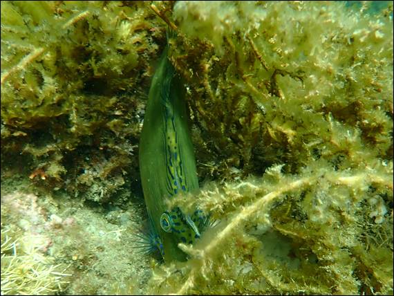 In these weedy areas while I see lots of fish, it is way too easy for them to duck undercover. It is however a good place to spot cephalopods, such as cuttlefish and squid. The former do not usually move as fast and are less skittish, and the latter tend not to go into the weed from what I have observed. I didn’t spot any cephalopods this time, but did start to see groups of the same leatherjacket. Being shallower I had a slight advantage this time, and was eventually rewarded with an almost in focus image, as this fish darted away: