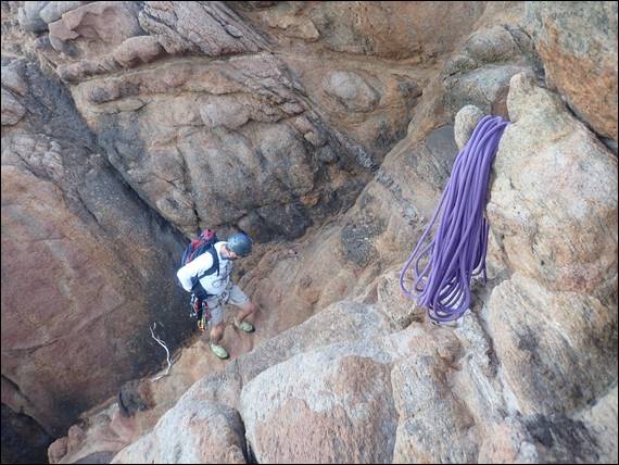 As you’ll see between the above and below image, it really doesn’t take long for the sun to creep up on you in this place. So Howsie was in full sun as he got to the traverse. There was the usual Howsie yo-yoing, in a sideways fashion, as each time he inched his way closer to the flake. Then reversing the moves back to the safety of the stance just below the gear. Eventually he went for it and leaned over, holding onto not much, as his fingertips just made contact with the flake. Pulling over the flake Howsie was deservedly very chuffed, as you will find out if you watch the video: