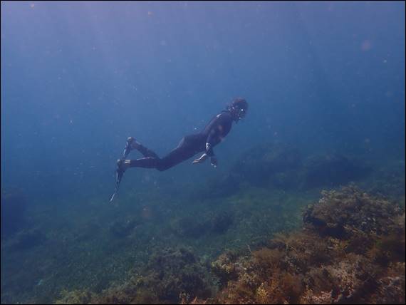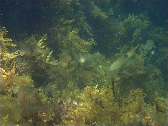 On our return swim we attempted to head into the canal, and just as we went under the bridge we spied a large group of squid watching us. As we attempted to head into the deep canals the swell was starting to pick up and it really didn’t look all that inviting. So instead we turned around and slowly pottered back to the beach, spotting plenty of life below us along the way. Fair to say that Howsie may not have bagged three 22s today, but he did get a great one under his belt and we both had a very fun climb and snorkel: