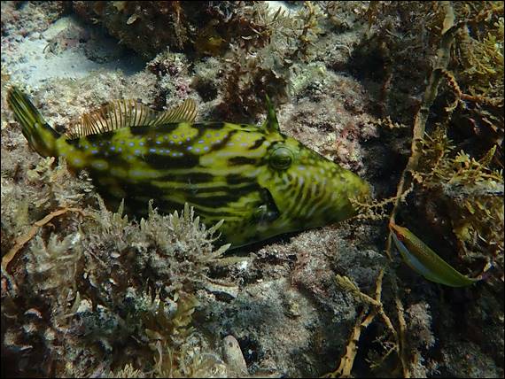 They seemed to be in full feeding frenzy, mixed shoals of fish were hovering round the rocks. As the larger species pecked away at the rocks in search of a feed, the smaller fish seemed to be waiting until the dislodged bits floated out into the water allowing them to dart in to grab them. As I went down the big fish swam away quickly, while the smaller ones kept feeding not being too worried until I got really close. This Bluelined Leatherjacket (Meuschenia galii) and Brownfield’s Wrasse (Halichoeres brownfieldi) didn’t however seem to mind me saying hello: