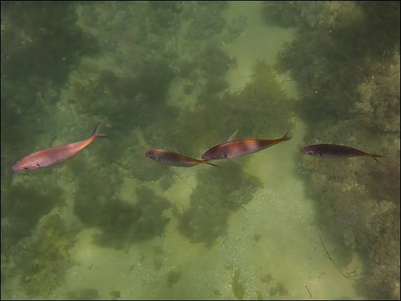 This week however, the water looked inviting, seeming to be relatively calm and potentially clear. The stark contrast in colour between the water over the sand and reef being a great indication of how good the visibility was likely to be. As a result of this I have taken advantage, and had a couple of dips during the week and one today. The first dip was on a hot and bright day with amazing visibility, and I soon found myself 150m plus from shore. Here four fish appeared and stayed with me for the majority of the dive. Staying mostly below me, and not being afraid as I duck dived down: