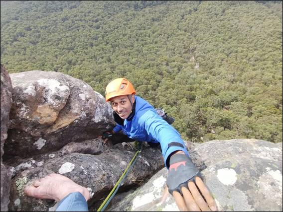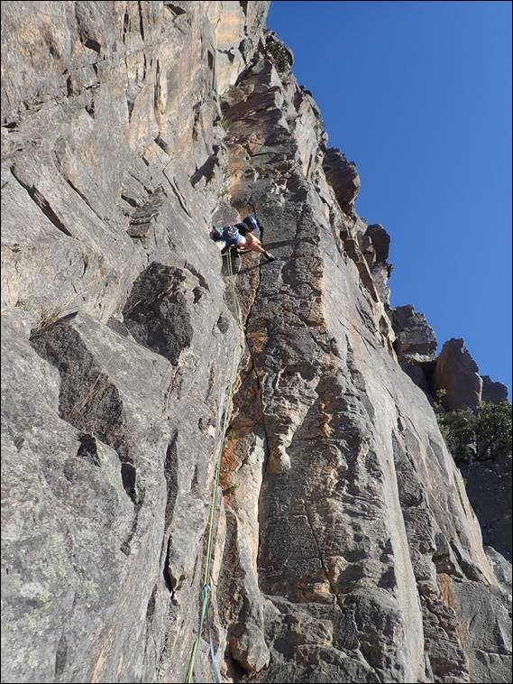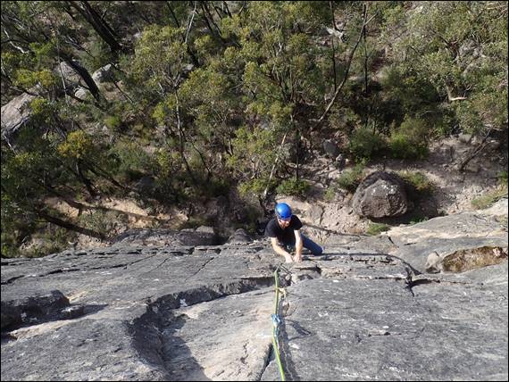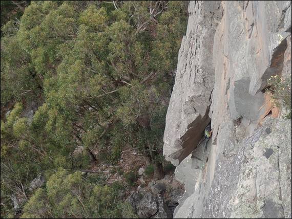 I had three targets in mind in relation to the climbing. Hit trad lines, get some long multi-pitch routes in and have fun! Dan suggested Mount Rosea as the ideal location, providing four to five pitch routes up a 120m cliff and nearly all of it trad. It was a great suggestion and for an introductory route on the first day we climbed Debutante at grade 14 (VS 4c). What struck me was the steepness and physical nature of the climbing. Very different from the often slightly slabby (off vertical) more technical climbing in Western Australia. This route was both continually engaging and sustained, it was a great line: