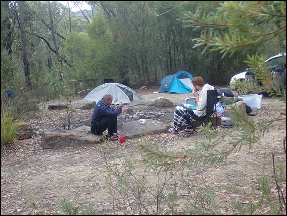 After our walk in the clouds we made our way back to Halls Gap to decide what we would do next. It was still wet and claggy, with clouds lingering on the hill tops and dampness hanging in the air, the sort that chills the bones. So we treated ourselves and went to the ‘locals’ café. Here it felt luxurious sitting at a table, being indoors and having a hot meal. Here we inspected the radar to see what more was to come, the forecast now indicated rain might continue till the wee hours of the night ahead of us but should abate in the north. So after the meal we went north to the Mount Zero campsite, where we had secured the last remaining available site: