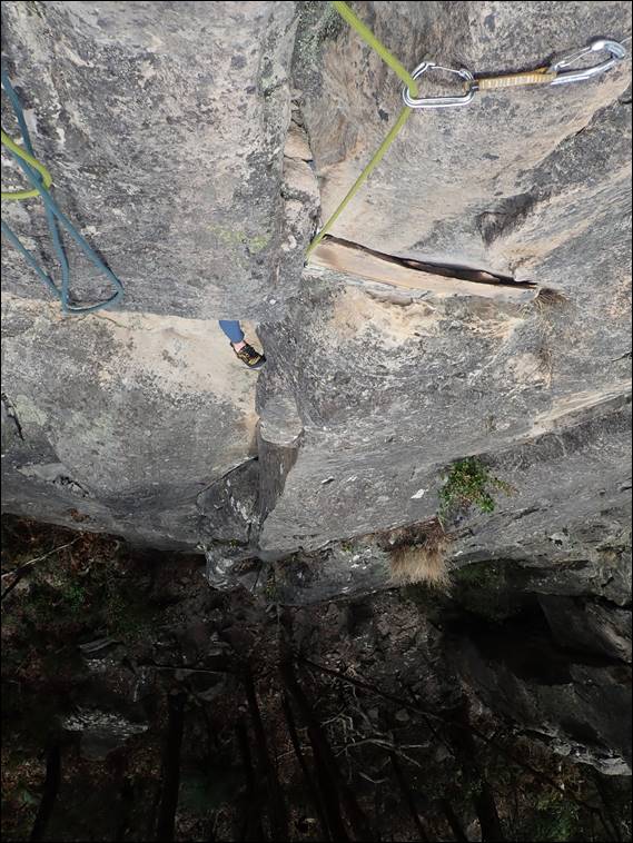 To add to the so called pleasure of the experience, I was completely stuffed. I was also foolish enough to climb this one in one pitch, when it is written up as a two or three pitch route. So I had some 40m of rope out below me when I got to the roof and the drag was getting pretty challenging. Then it started raining and to top things off I finished the line by heading right to a final slightly overhung headwall. Adding both length and steepness. The last part you might ask why, and the rationale in my head at the time was I could see there were bigger holds there. Not that my mind was really thinking very coherently at that point. A route I will certainly not forget in a hurry: