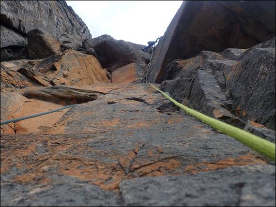All my outdoor footwear had decided to fall apart at the same time. So one reason for being so keen to free my feet of my climbing shoes, was that I foolishly had brought a new pair with me for this trip. Breaking in a new pair of shoes can be a tad painful, but they were not too bad all things considered. I had also brought along a new pair of hiking boots and was also breaking them in. But they fitted like a glove and were comfortable from the start. We carried our shoes up for the walk down, and the person coming up each pitch on second carried up a small rucksack with snacks and water, which we dipped into at most belays: