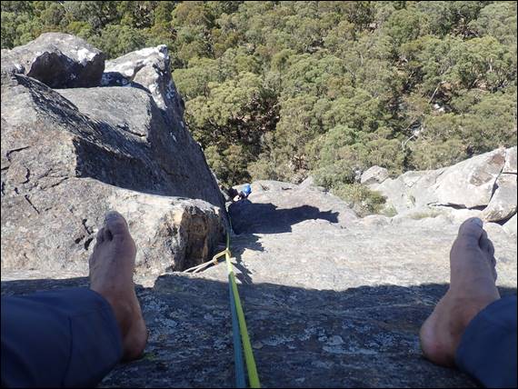 Time for some lunch, but this time afterwards Dan was keen to jump on the first pitch of another route. The Accension, grade 21 (E3/4 5c/6a), which the other party were climbing. It was a great pitch, very technical and also very, very pumpy. While I got up it I found it too pumpy at the crux sequence and was promptly spat off, but I did enjoy it. This climb had anchors at the first pitch and here we met Glen and Karen Tempest, as they abseiled from finishing the two pitches above. Glen is one of the great Australian climbing pioneers, not that I’m huge on keeping up with who’s who in the climbing (or any) scene: