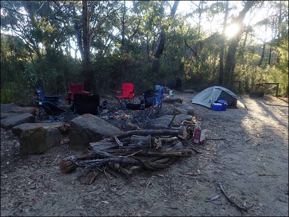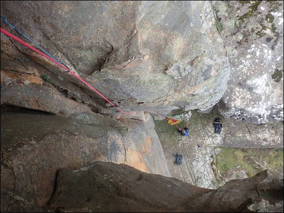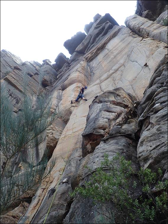 One climb may seem a bit light on for a day. However, it didn’t get light till 6:30’ish and time soon drifted by what with breakfast, a short drive there and back, half an hour walk into and then back out of the crag, and an equally long decent from the top of the cliff to the base after the climb. Plus we were not rushing the climbing, enjoying the exposure and scenery, siting at each belay just because we could. We stayed at a bush campsite with no facilities, a small spot but ideal and out of the way: