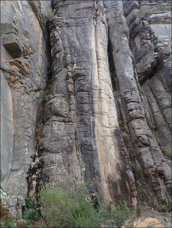 The rock varies from layered formations to what looks like solid sandstone. Quartz nodules can be found, and in some areas where it was once tidal there is evidence of ripples, worm burrows and some small fossils not that we saw any. We did find quartz nodules and they reminded me of the pebbles found in the UK gritstone. The difference here being that there was rarely a need to use them with as much commitment as required on that UK formation. This rock provided not only great features but also good friction, which was especially useful on the steep corners: