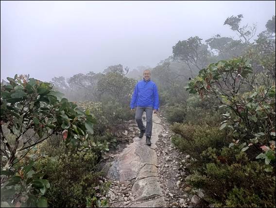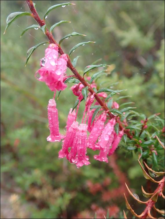 Both of us were feeling our legs, after four days of fairly solid climbing they were a little tired, and the steps on the path were a killer as we went up. The view from this peak is a 360 degree vista across the surrounding plains, but we saw none of it. We didn’t even get to see the peak from the ground, as we approached or left. Shrouded in mist for the entire time our spirits weren’t dampened and it felt good to be out. I was hunting for plants of interest, but sadly not being the season for it we only saw the Common Heath (Epacris impressa), for which there is an image above: