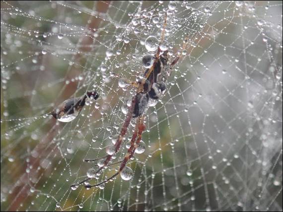While it didn’t rain on us everything was covered in moisture, and the beads of water on the webs made them look like pearl necklaces. We found quite a few webs from the Leaf-curling Spiders (Phonognatha graeffei). The spiders were no doubt cosy and dry in their homes made of the distinctive curled leafed in the centre of the web. The only spider I saw that was braving the elements, with us, was this very wet looking spider. But with all the water beading over its body I haven’t been able to identify what it was: