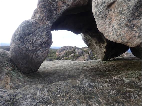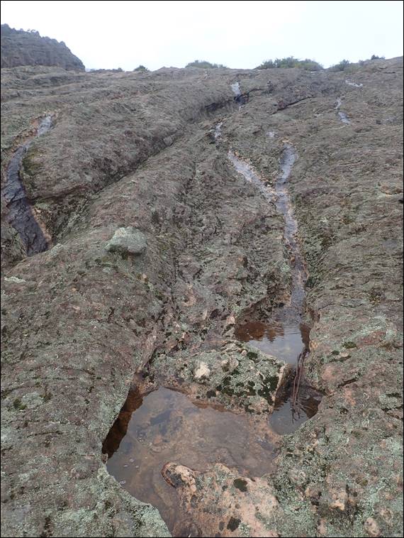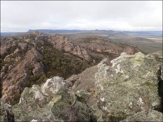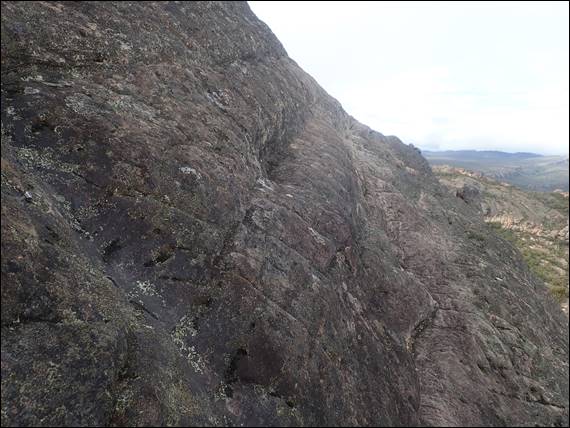 The ascent required a little scrambling, and the above traverse across a slab with a nasty long fall awaiting anyone who wasn’t surefooted enough. This risk had been recognised by someone, and they had placed a single glued in machine bolt to allow people to rope up. If you look carefully at the left hand edge of the image above, you might find it. I feel safe in saying this was unlikely to have been installed by the park managers, as they would have placed a ringbolt. Despite the conditions, I was unperturbed by this slab and summited to spend time enjoying the 360 degree view from above: