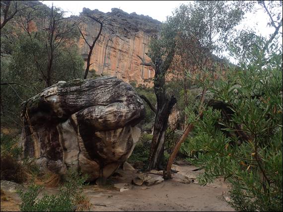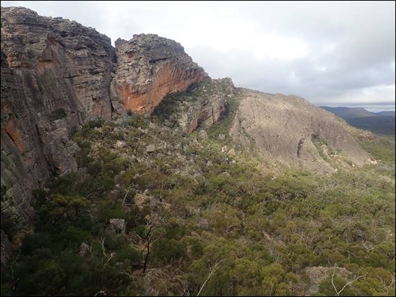 From the top I had a great view across to the mighty Taipan Wall. This wall, currently closed, had put Grampians climbing on the world agenda. It’s a very impressive sight, but it was not where we had intended to climb on the Monday. Our original plan was to hit the walls to the left, called Grey and Green Walls. Way more slabby, which would have been good after all the steep stuff of the first four days. But today, and no doubt yesterday the green was way more visible than the grey. The saturated moss and lichen, along with seepage lines down the wall, would have made climbing on there a very serious proposition: