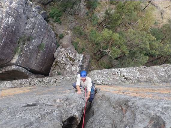 We knock it back a bit, not only due to the warmer day but also as we were both feeling the last few days hikes and climbs. Heretic at grade 17 (HVS/E1 5a) provided yet more fun on steep corners and cracks, with nice long pitches. The rock here is a sandstone, and the history of how the amazing rock formations of the Grampians came to be is a worth a few words. The area was once a shoreline with oceans to the east, and the sand and mud deposited by the rivers from the mainland washed in along the shoreline. These have long since been compressed and folded over the ages to create the rock we see today: