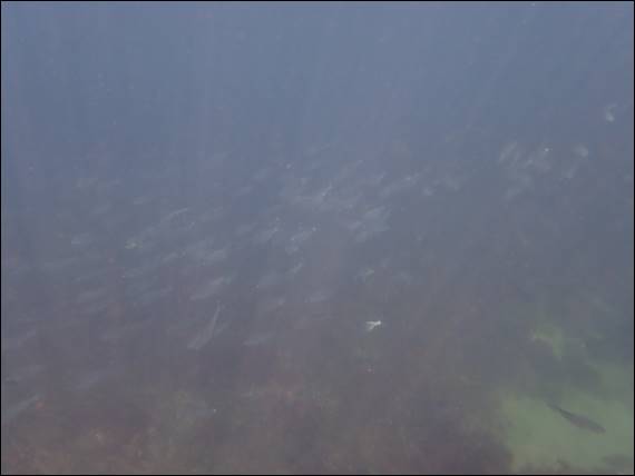 The 2000 plus year old weather prediction method proved right once more, and over the next few days a series of fronts came through bringing rain, bigger swells and winds. The fronts passed and we were greeted with more settled weather, as the weekend approach. This made me hopeful as I was busting to get one more snorkel in before retiring the gear to storage. So on the 1st May I kitted up with my full length weight suit, encouraged by a flat almost glassy looking ocean. People were fishing up and down the beach and I came across their intended prey soon after jumping in, a large school of herring that was barely visible: