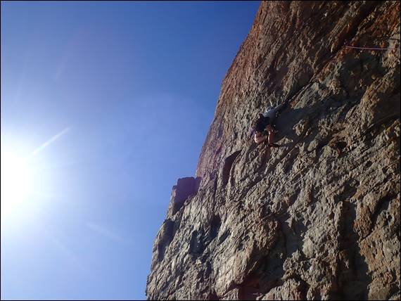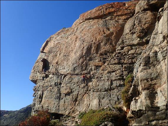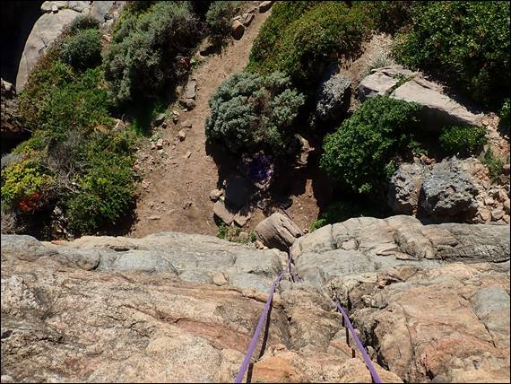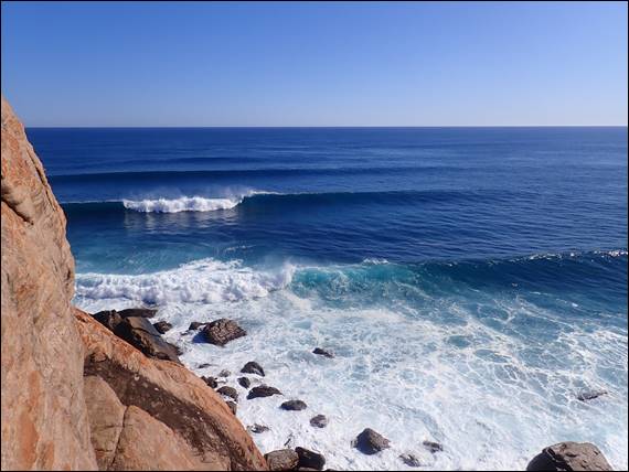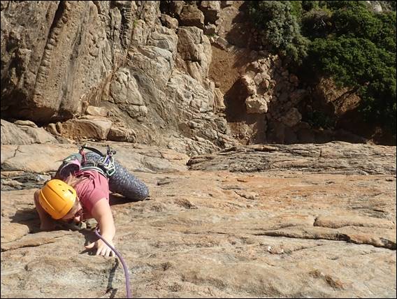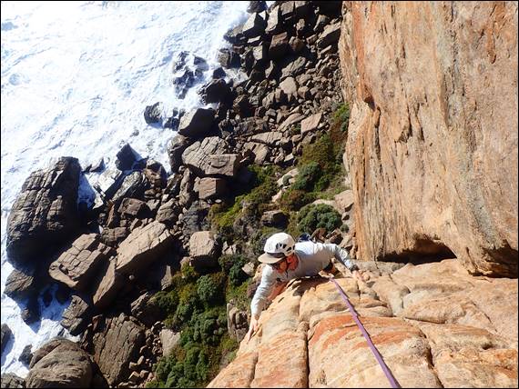 Today, with Steel Wall all to ourselves and the rock in perfect condition, it seemed the perfect chance for Ash to finally lead the first pitch. I couldn’t tell his thoughts but he set off up the initial crack all smiles and happiness. At the traverse I wasn’t able to see his face anymore and the pace slowed, but he seemed to be calm and steady as he inched towards the exposed crux midway along the traverse. It had certainly looked all smooth and controlled, but he confessed afterwards that he had probably used up all his adrenaline bank on that lead. As he set up the belay, in a nice shady spot, Maddie and I remarked on the clean waves were today and how it would be nice to see some dolphins:
