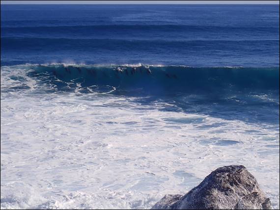 And just as we mentioned it, we spotted a fin pop up. Maddie was up next, so I left them to it and wandered along to find a perch to watch the show. Being greeted with a spectacular sight, as the large pod cruised past us and then as they came back they started to surf in on the big waves. With the sun positioned behind the waves I got a stunning view of them having fun. Transfixed watching them I thought to take a video at the last moment, so only captured the tail end of the show. I didn’t ask if Ash had witnessed the fully glory of the sight, as he was no doubt also keep a close eye on Maddie who also looked to climb the traverse confidently. Stepping up past the crux without a stutter or whimper. As the dolphins swam further north, the interlude was over and I tied in: