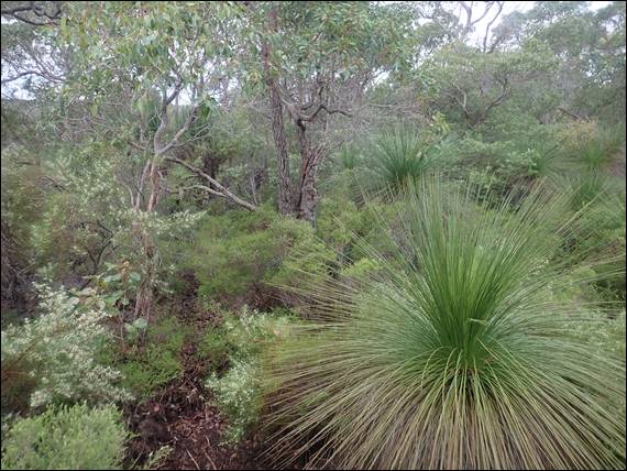 Not having previously sighted either of these orchids before, needless to say I was chuffed. Then as the track reached its peak and the ocean came into view for the first time I spotted a small group of Jug Orchid (Pterostylis recurve). Not only are the colours different, but the sepals point down, whereas for the shell orchid they go up. Lisa would have liked this section open views, easy path finding and a few good finds. Although she might hint we should keep moving. The book advised to keep a look out for a track on the left, which would be found soon after the main track started to descend: