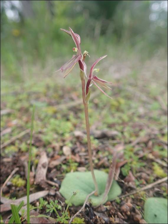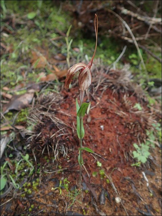 Fortunately the path went back to a wide track, easy to follow and impossible to miss as long as you took the right direction at each junction which the booked helped me to do. The battles behind me were rewarded when I spotted a Cape Mosquito Orchid (Cyrtostylis sp. ‘Cape Naturaliste’), and as the name suggested it is only found on this stretch of coastline. I am not sure how I spotted it without my glasses, although the next two finds were a bit more obvious. Above, sadly just starting to wilt, is a Curled-tongue Shell Orchid (Pterostylis rogersii) of which there was a group all in the same state: