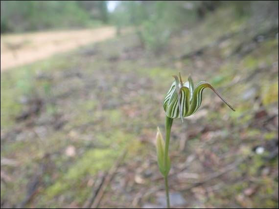 I feel like they were pretty safe, I honestly can’t see too many people ever making their way along that path. Indeed as I got to the valley floor the tape disappeared and I was left to find my own way the last few hundred meters to Ellensbrook Road. I was not so thrilled about walking on a road, but it wasn’t a huge distance and I knew that once I reached the coast I wouldn’t have to battle my way through any more scrub. Plus I spotted a couple of Banded Greenhoods (Pterostylis vittata), one of the more commonly found greenhoods but still great to see: