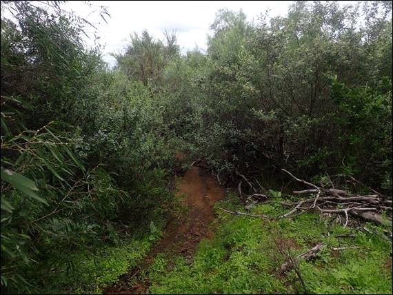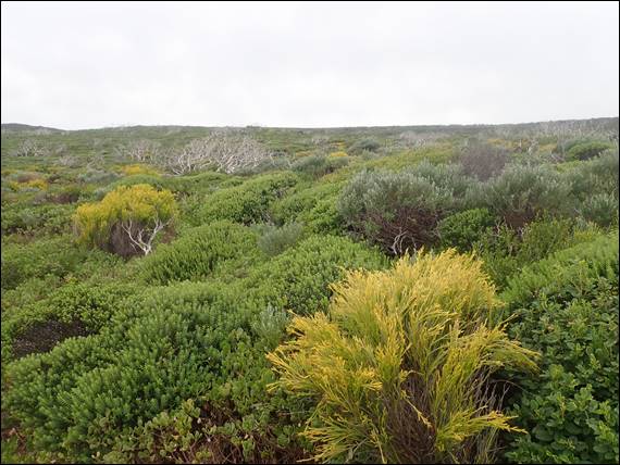 I found it and stood there looking at it for a while. It was clearly a path, but with the scrub leaning well over the narrow path I was again reminded of what that previous section had been like. The book stated that this path should be followed for 1.5 kilometres, the same distance as that last horrendous, even by my standards, track had been. It was definitely the right way, and there was even some tape marking it so I imagine it does get used. That same voice suggested I find another way, but I resisted that temptation and was pleased to find it was not as thick or hard to negotiate as the last track: