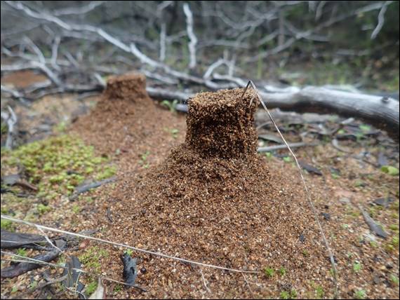 With the scrub easier to push through I kept an eye on the ground and spotted quite a few fungi. I did not stopped to take too many images of the fungi, I just didn’t want to squash them. In fact I didn’t see any squashed ones and also didn’t see any footprints, as I made my way down off the ridge. I also noted that all of the anthills, yes that is the name of these small structures, were intact. I did stop just once to watch one of them. The small ants went about their business unaware of the perilous location of the entrance to their underground home, being right on the marked path: