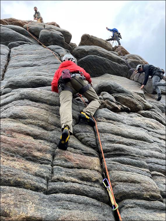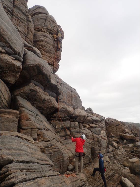 It was a tad feistier than I had hoped for as a warm up, and I felt pretty tired and uncoordinated as I made my way up it. This was despite avoiding the direct start because it seemed a tad wet and slippery. The boys were still enjoying their more appropriate warm up amble, as Craig and I walked down. While he had not climbed for eleven month’ish he made surprisingly short work of the route I had led. So it was clear he was still capable and as such it made sense to throw him on the next lead, which he didn’t seem to mind: