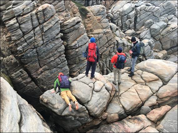 As we passed the northern section, Howsie was eyeing up Kami-kaze Catfish (20) and I was looking longingly at The Plough (18). The latter being on the lowest section of the crag, and as such the bottom part was subject to wave wash. Therefore, despite a strong will to climb The Plough, after having had a beer and meal in its namesake pub in Hathersage in the Peak District, we walked on by. As we did we checked out the cool selection of faces along the way, including of course the mighty zawn. But that too had waves tumbling in making it look pretty uninviting: