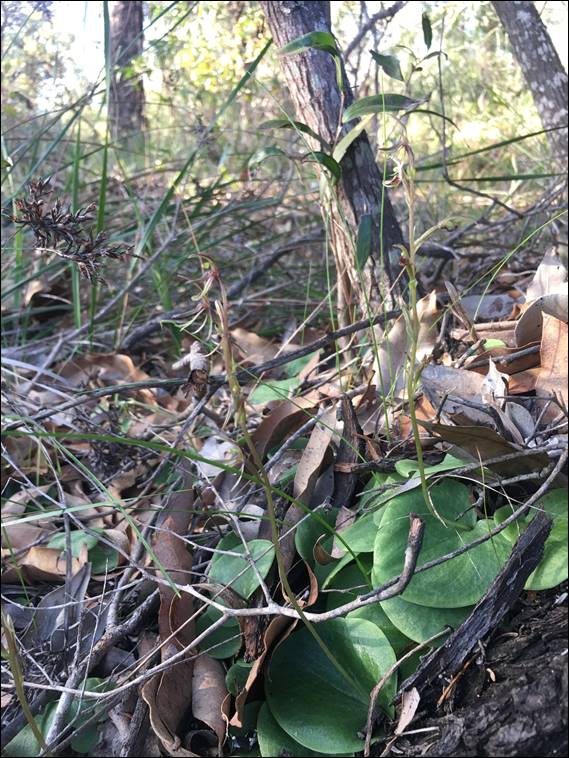 With respect to orchids we spotted the obvious finds, and she told me she had also heard the recent rumours of the Queen of Sheba being spotted in the Bunbury area. And I note now that this seems to be an rumour that pops up most years, and for most years in just that. We did however spot a small cluster of Midge Orchid (Cyrtostylis huegelii), shown in the first image. And of course there were lots and lots of donkey orchids, which next to Spider Orchids are probably one of the most well-known and easily recognisable genus of orchids. Both have distinct, colourful flowers and being mostly tall they are easy to spot. As we looked at them we wondered if there was more than one species out, and the penny dropped when we came across the small patch shown in second image: