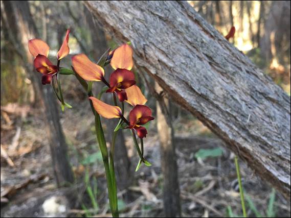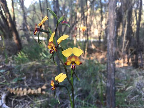 In that patch we found both the Yalgorup Donkey Orchid (Diuris porphyrochila) and Winter Donkey Orchid (Diuris brumalis), in the two images above. The colouration being distinctly different. The yellow and much brighter Winter Donkey Orchid is very similar to the Common Donkey Orchid (Diuris corymbosa), but the range of the latter tends not to extend as far south as Bunbury. Then as I scrolled through the images preparing for this post, I spotted the one below. Again a different colouration in the main flower, but also the two downward pointing sepals. This one being the Kemerton Pansy Orchid (Diuris cruenta), the range of which extends along the coastal plains from Lake Clifton to Capel: