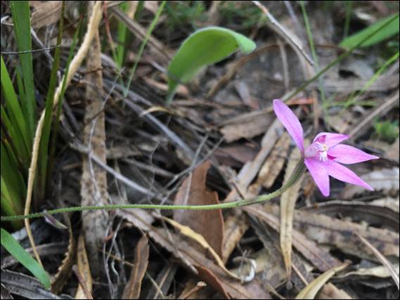As Jo and I came to the end of our wander she told me of another species she had spotted before I had turned up. It was just off the track and I had walked right past it, so we went to check out the above Silky Blue Orchid (Caladenia sericea). This species prefers lateritic soils, which is rich in iron and aluminium, but can also found in the coastal banksia woodlands that are found on sandy soils. And as we were admiring it, Jo spotted our final find shown below. This may be a Little Pink Fairy Orchid (Caladenia reptans), as it has a relatively small flower and the arrangement has the lower four petals pointing downwards. But the stem is mostly green, and the Little Pink Fairy Orchids are usually a purplish colour. So I’m sitting on the fence about this one: