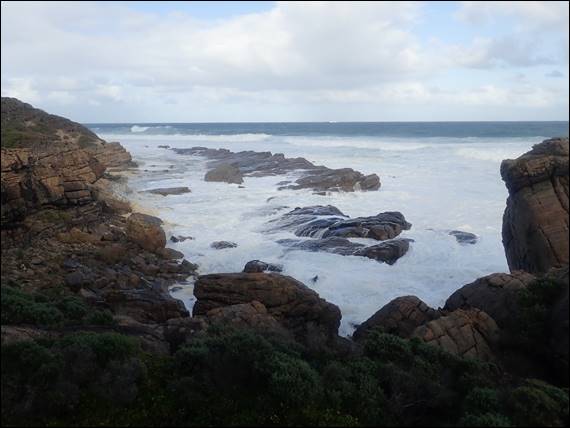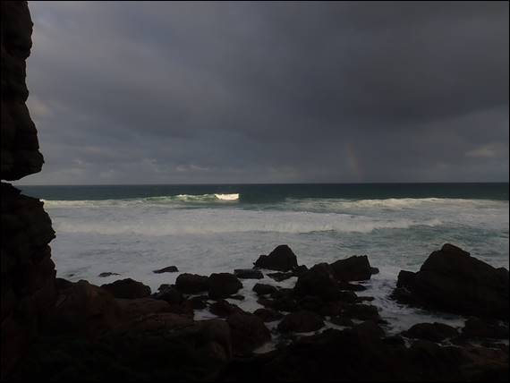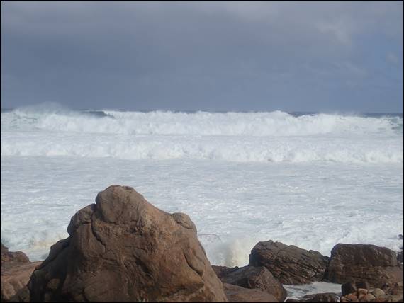 On the first route our fingertips were tingling from the cold, but the friction was great and we balanced our way up. I took the first lead, so by the time Craig jumped on the sharp end he was at least a bit warmed up. Today, in contrast to the view of a tranquil flat ocean that Lisa and I had seen yesterday, here on the exposed west coast the ocean was a mass of boiling white water. Big thunderous waves came in quick succession, and even quite far out to sea they became an indistinct blur of white. That was until they made land fall, sending spray high into the air: