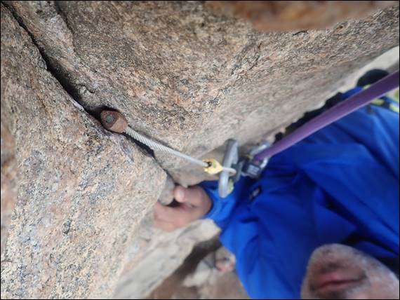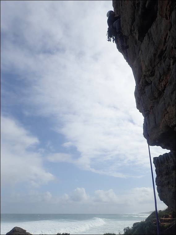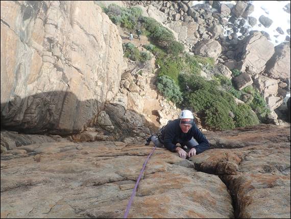 Due to the northerly wind the continuous salt spray, which was giving the ocean a hazy appearance, didn’t head our way and the rock was lovely and dry. The tide and swell were such that the usually sandy beach, just to the south was just a mass of water. I’ve just checked the swell and it peaked at 7am today, which is when we arrived, tipping in at just shy of seven meters. Unlike yesterday’s ocean conditions today it didn’t make me think about snorkelling. It’s a good job that loose flakes such at the one above doesn’t have that same impact on me with climbing: