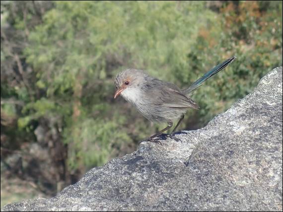 So I’ll be back sometime with a willing assistant, to get a second opinion on Aaron’s find, and clean and decide on bolt placements for the two that I feel are worthy. From what I have described it may not sound like I did a lot of climbing. That was however never the intention, it was about knowing what was worthwhile and what wasn’t. That said it still took a fair chunk of time and the fog was well and truly gone, as I got ready to pack up. While sorting the gear a male and female Splendid Fairywren (Malurus splendens) started to work their way towards me. The above female was the brave one, while the stunning blue male kept his distance: