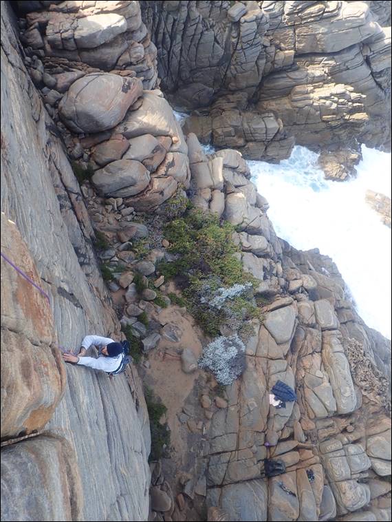 Being his first visit here we headed to Hands Up Wall, with generally longer lines. And I was pleased to observe that while the rock beckoned, Sam took a moment to soak in the setting. Cleaning rolling waves out to sea, crashing white water below, a picturesque rocky landscape, and he even spied a couple of ‘whale blows’. Something that is a technical term in the whale watching world, defined as ‘a cloud or column of moist air forcefully expelled through the blowhole when the whale surfaces to breath’: