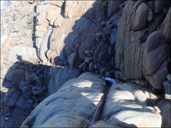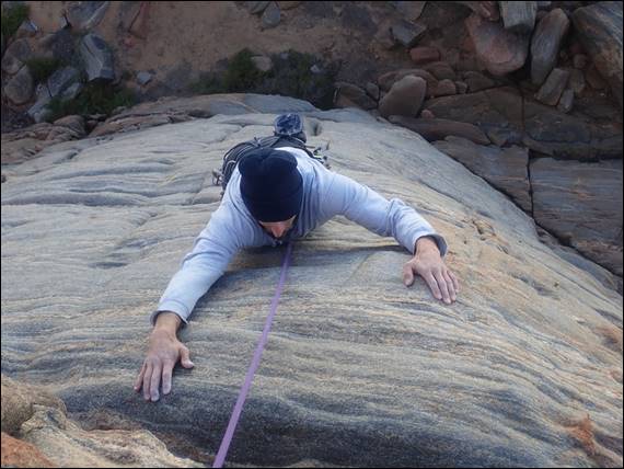 The rock is generally rounded and smooth, but the fine grained granite provides amazing friction. If it didn’t the climbing here would be extremely difficult. That said this is how it can feel until you fully trust that climbing shoes and fingers will stick to the slightest of ripples on the rock. On occasion, as below, there may be no holds of note and you have to have faith in nothing but friction for all four points of contact, which is created by body tension. It can be a very disconcerting feeling, and one that requires a slow and steady approach, and a cool head: