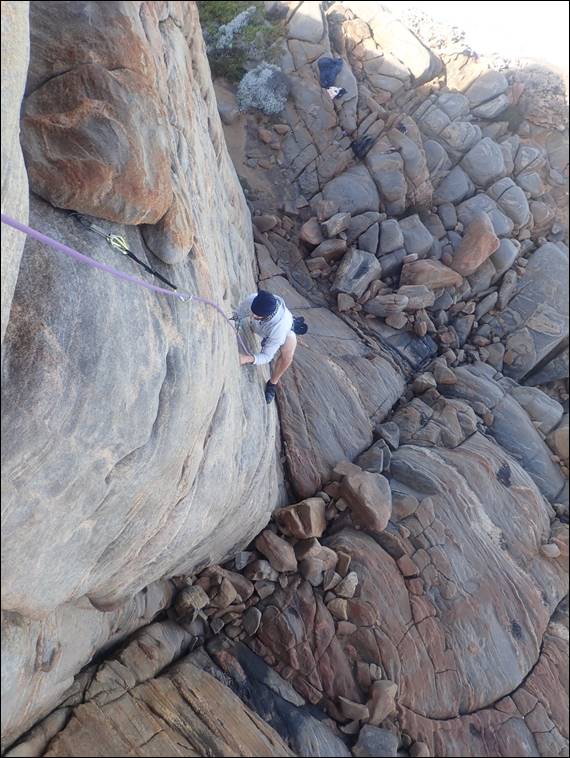 For Sam’s third trip out for a climb I suggested Moses Rocks. In part as it is a favourite spot of mine but also I have to admit that was also keen to have a quick sticky beak for a particular orchid that is only found these parts. However, other than briefly scouring the scrub as we walked in we didn’t spend any time looking, and as such were not successful. In addition to my own selfish reasons I also feel it would be good for him to sample the climbing style required on a different rock formation Moses offers: