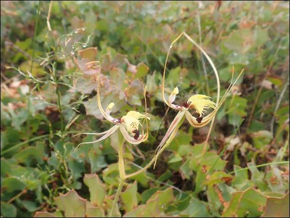 Today started very well. I was a little surprised that a spot like this, being exposed to the full force of whatever the Indian Ocean might throw at it, would have been a bit harsh for plants as delicate as Orchids. I could not have been more wrong and managed to find lots, including the one that I was very keen to spot. That is the first orchid image and is the Funnel-web Spider Orchid (Caladenia infundibularis). The one above is not so clear and may be the same, but the clubbing on the petals is more prominent. I am however not game to try and identify it: