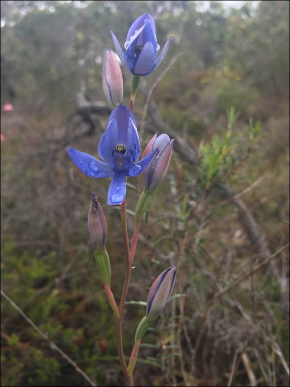 Due to claggy weather, while I found lots of sun orchids none had fully opened up. In fact most looked like they had decided to stay asleep for the day, keeping their flowers safely tucked up in their closed buds. This was the only one I found that was anywhere near open, so it was the only one I could identify. Being a Blue Lady Orchid (Thelymitra crinita). I feel the water beading on its petals may have made it think that it had made a mistake by starting to open. Although it did make for a lovely image: