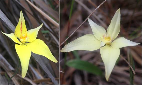 There were of course a few usual suspects in addition to what I have included, and below there are two images of Cowslip Orchids (Caladenia flava) I found. My reason being that the one on the right is an albino form, the only albino I have found of this species to date. Even with the relatively dull weather taking an image of the albino form was a tad tricky with my basic cameras. That wraps up the finds at Gracetown, and it was then time for me to drive to the next spot: