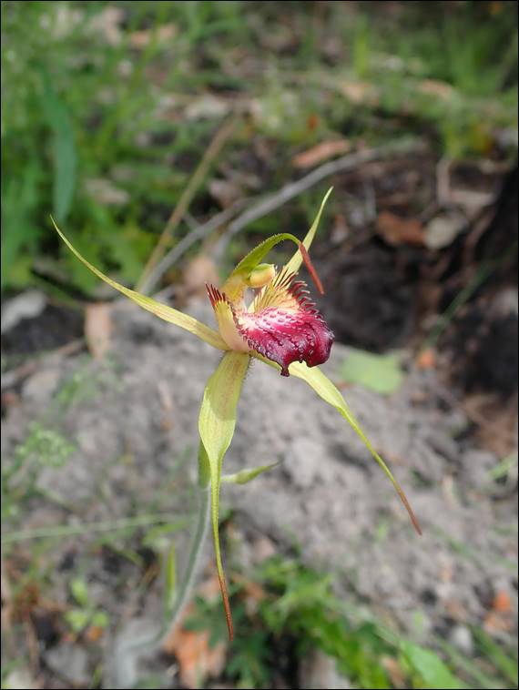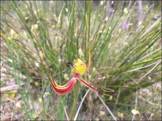 Lisa and I spotted the above and below orchids recently, but I was still excited about seeing them for only the second time. As such I have included an image of both, being a Scott River Spider Orchid (Caladenia thinicola), above, and Swamp Spider Orchid (Caladenia paludosa), below. These two I was able to identify, although it did feel a little strange finding these on a high sandy ridge. I thought they would prefer wetter conditions. But this year I have been fooled a few times by believing what I read, so I should be used to expecting the unexpected: