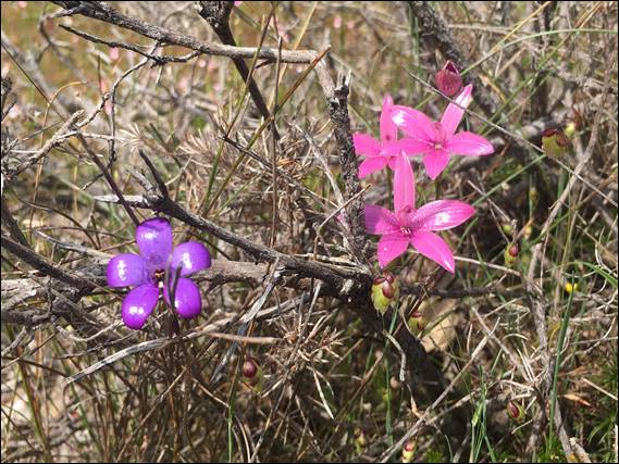 I was again not disappointed and also was a little amused when I came across hundreds of Pink Enamel Orchids, this time some of them were mingled in with Purple Enamel Orchid (Elythranthera brunonis) proving a perfect photo opportunity to show you what I mean about how different they are. Even though the Purple Enamels can and do change the hues quite considerably with age, there really is no way to get these two mixed up now. Also seeing so many today I wonder if I have simply not been looking in the right places for Pinks Enamels all these years: