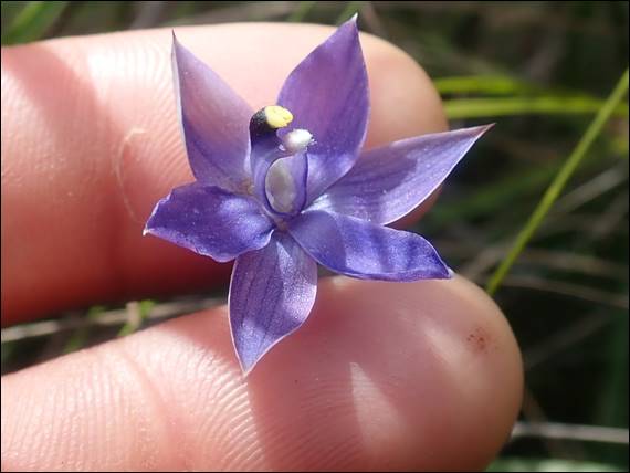 It was conveniently on the way home, so I popped off the highway onto Ruabon Road and as per the directions given drove a short way up until I could see all the sun orchids. Back on foot I started to check out the scrub, and found plenty of Scented Sun Orchids (Thelymitra macrophylla), of all colours from pale blue through to a deeper purple. But that was not what I was after and I kept looking about. I found the familiar basal leaf, but none of the plants had an open flower. This is an orchid that (work) Josh was very keen to spot, so I kept looking. Eventually I found one that was open, and as is often the case I then spotted another, and another, and so on: